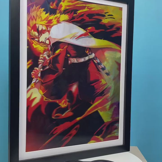 Gracias a su tecnología lenticular, el póster muestra diferentes escenas al desplazarte frente a él, creando una sensación realista de profundidad, dinamismo y acción. El enfrentamiento entre el Pilar de la Llama y la Luna Superior se representa con gran intensidad, convirtiendo este póster en una pieza imprescindible para cualquier fan del anime.